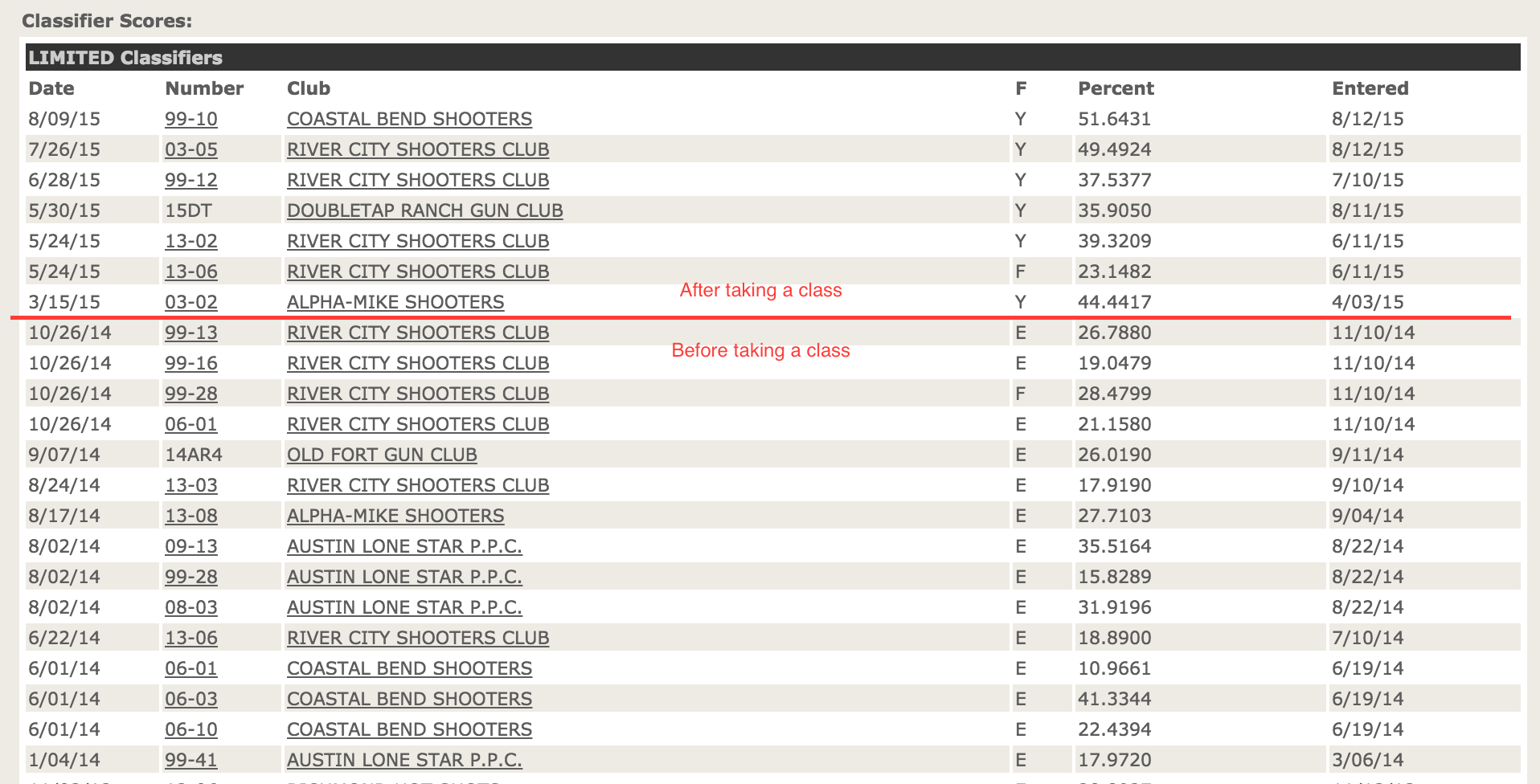 If you want to compete in USPSA, take a class. Seriously, it's difficult to improve if you don't know what you're doing. Below are my classifier scores for 2014 and 2015. In 2014 I went to a bunch of classifier matches with the hope that I would progress. I didn't. In 2015, I took a class in February and shot matches with only one classifier stage, you can see the improvement in my scores and consistency.